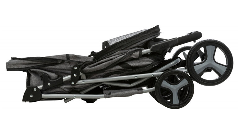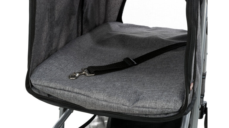 With 2 parking brakes. A large rear door for getting the pet in and out. Can be partly or fully closed with zips. Various net inserts, some can be covered. With 2 short leashes. Removable cushion (polyester), removable cover. With padded handle, cup holder and basket. Metal, polyester cover.